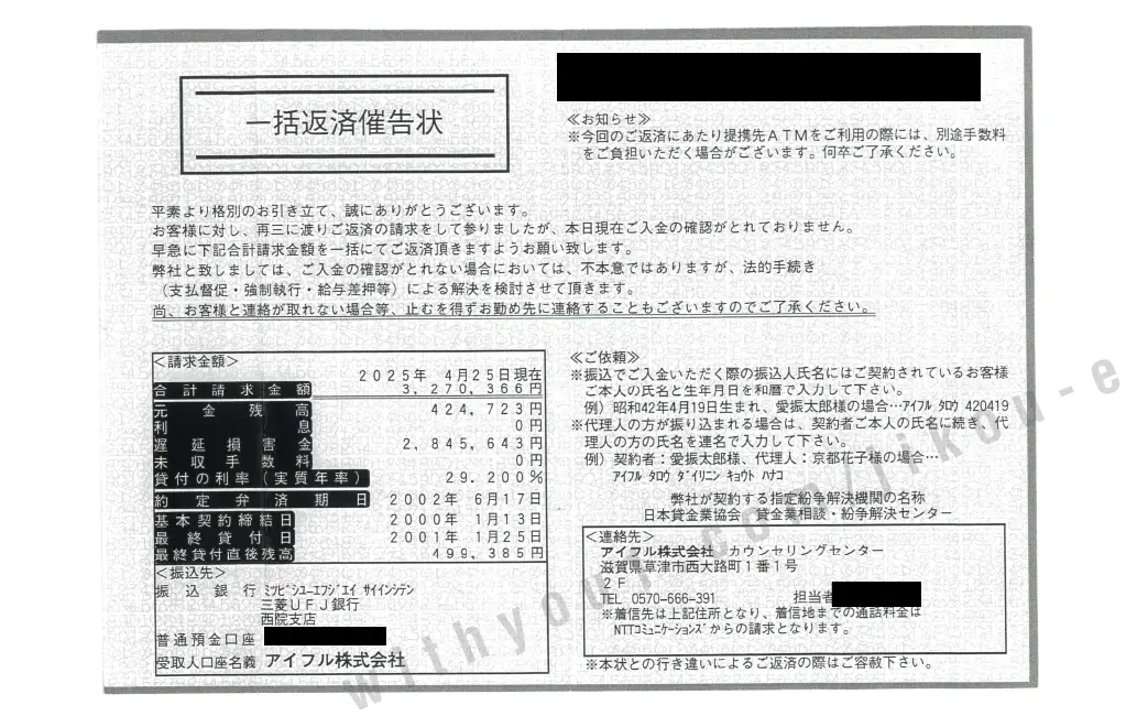 - アイフル「一括返済催告状」は過去の借金に関する督促
