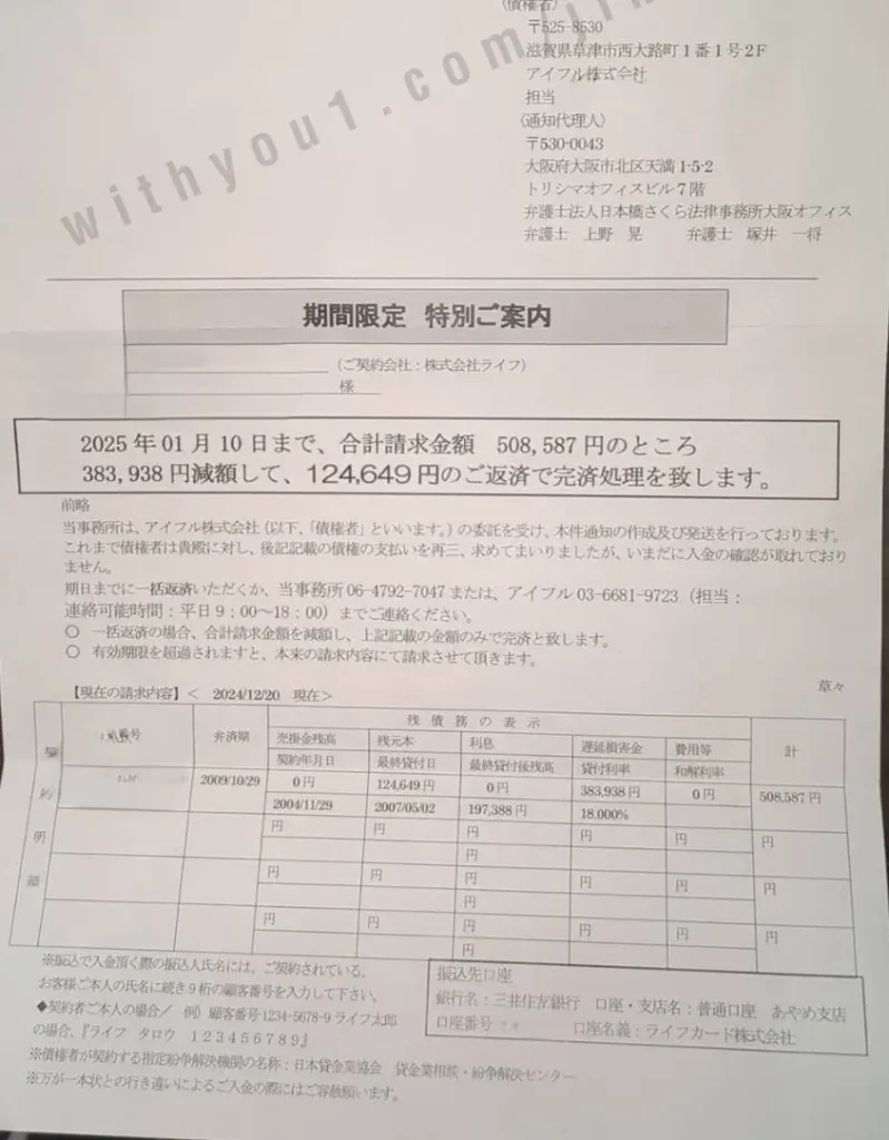 期日までに一括返済いただくか、当事務所 06-4792-7047 または、アイフル 03-6681-9723(担当: 連絡可能時間:平日9:00~18:00)までご連絡ください。