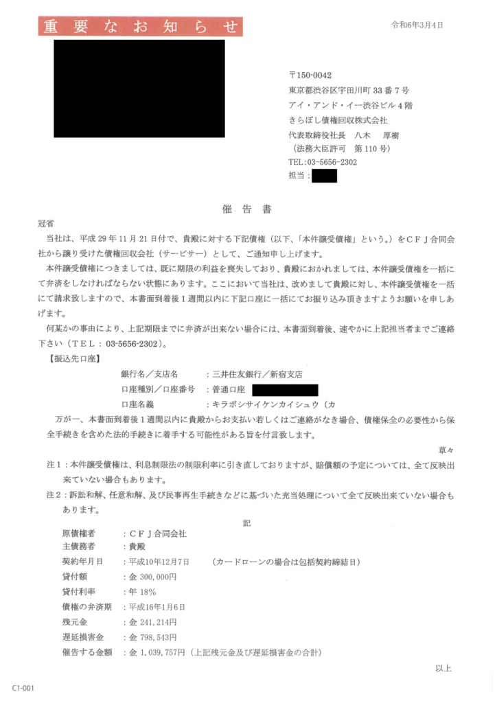 この書類は「きらぼし債権回収」がCFJ合同会社から譲り受けた債権について、一括返済を求める催告書です。