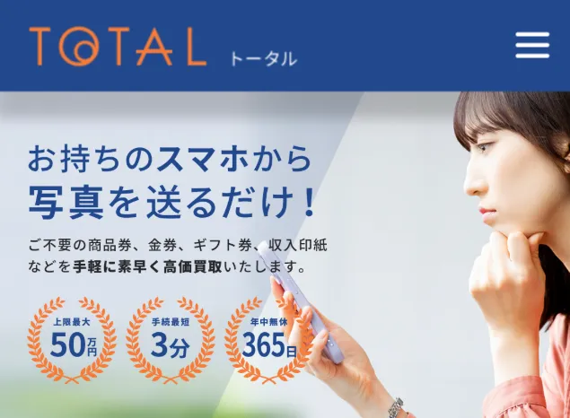 トータルはWEBサイト上で「手続き最短3分」「上限最大50分」といった言葉で利用者を勧誘しています。申込から入金までが非常に短時間で、ギフト券や商品券の写真を送るだけで手続きを完了できる手軽さを強調しています。
