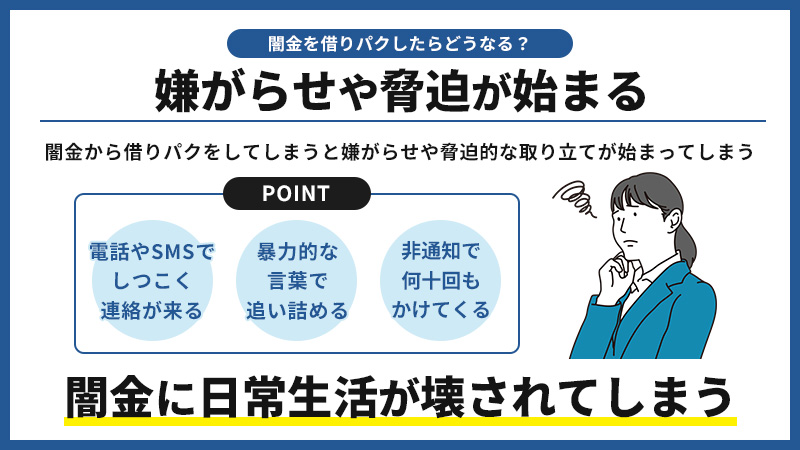 闇金から借りたお金を返さない、いわゆる「借りパク」をすると、法外な取り立てや嫌がらせを受けるリスクが急激に高まります。