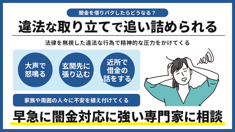 大声で怒鳴る、玄関先で張り込みをする、近所に聞こえるように借金の話をするなど、違法な行為で精神的な圧力をかけてきます。