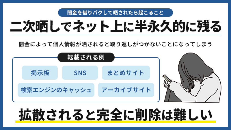 また、一度晒された情報は他サイトにも転載される「二次晒し」が起こり、削除が極めて難しくなります。